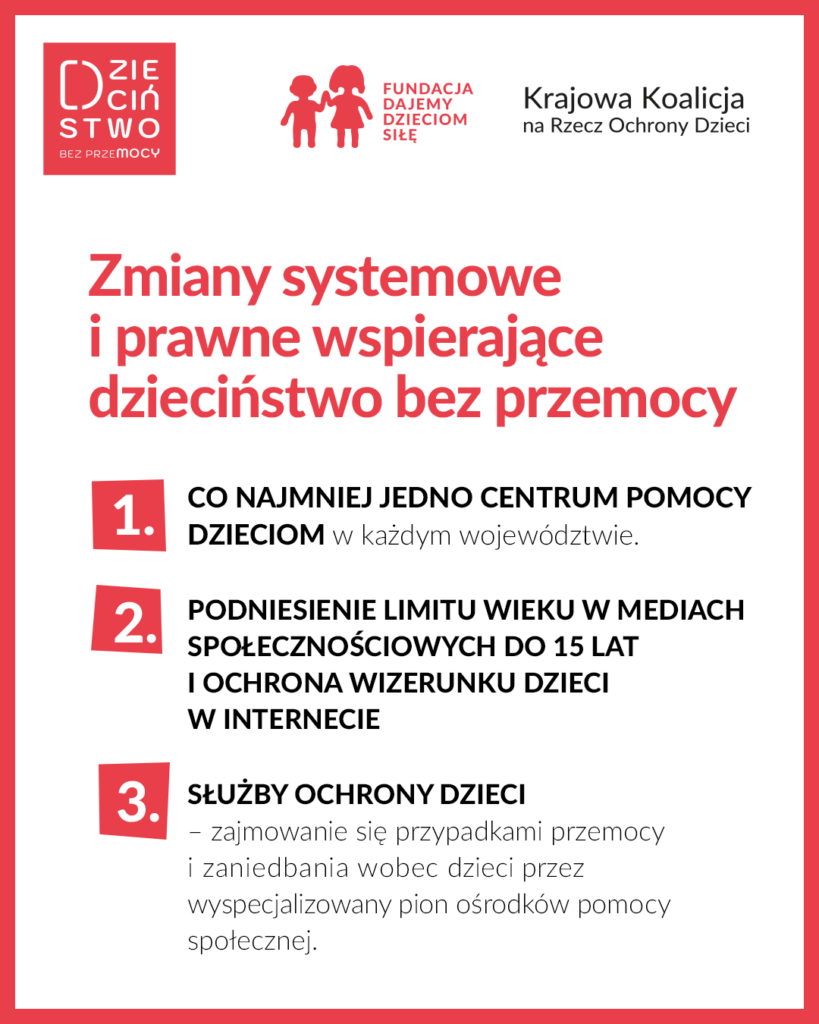 – Chociaż finał kampanii Dzieciństwo bez przemocy właśnie się odbył, zależy nam, aby przyniosła ona realne efekty w zakresie poprawy bezpieczeństwa dzieci w Polsce. Z tego powodu wspólnie z organizacjami Krajowej Koalicji na Rzecz Ochrony Dzieci przygotowaliśmy postulaty dotyczące koniecznych zmian systemowych i prawnych. Nie możemy zatrzymać się na budowaniu świadomości — teraz czas na konkretne decyzje i działania — mówi dr Monika Sajkowska, liderka kampanii Dzieciństwo bez Przemocy.