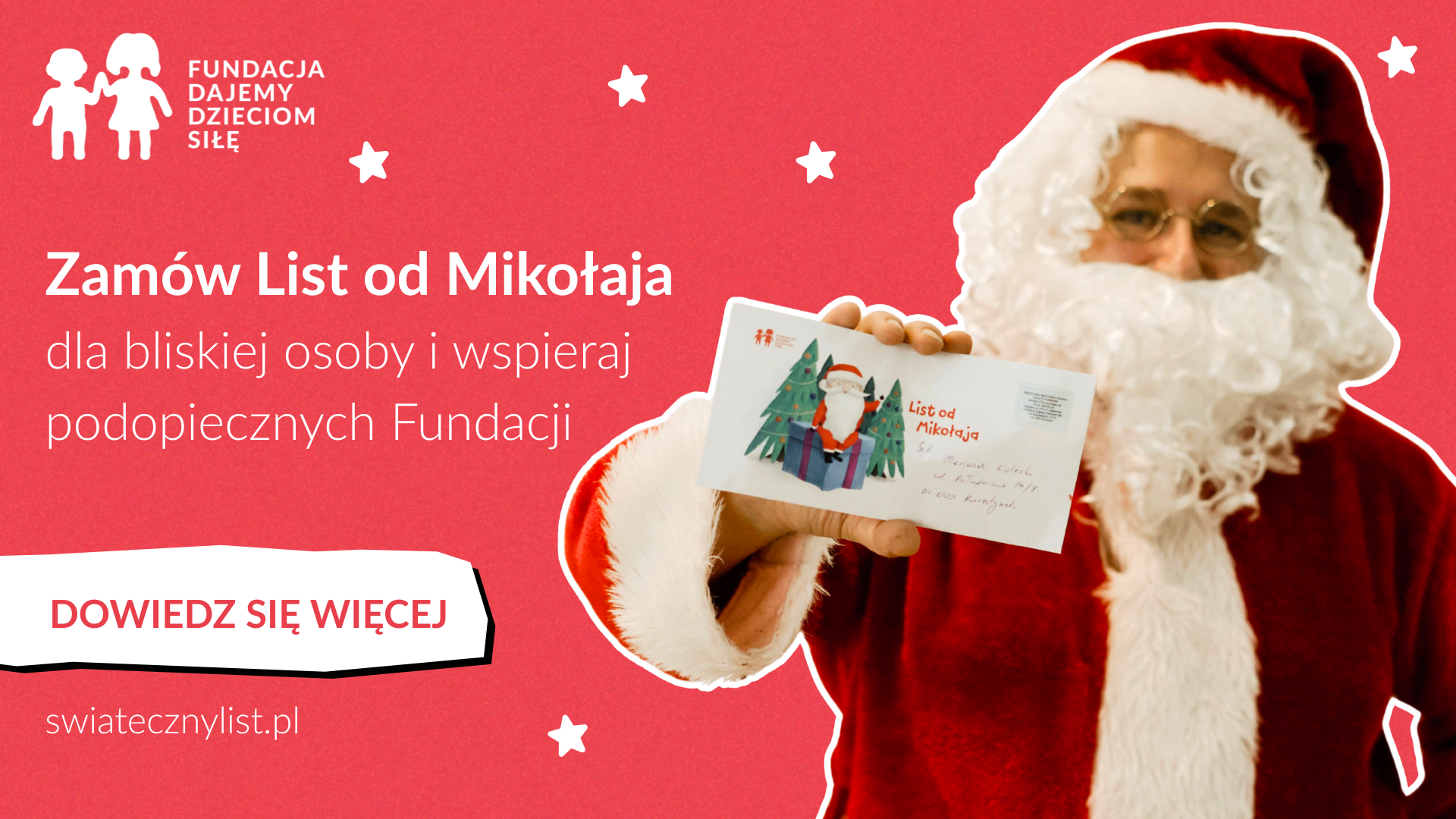 Zamów List od MikołajaTaki list ma podwójną moc – daje radość Twoim bliskim, a jednocześnie pomaga podopiecznym Fundacji❤️ Każdy list jest pisany na pięknej, świątecznej papeterii, zapakowany w ozdobną kopertę i może być w pełni spersonalizowany - tak, by obdarowana osoba poczuła, że to prawdziwa wiadomość prosto z Bieguna Północnego, specjalnie dla niej! W tym roku Mikołaj pisze do wszystkich, przygotował: