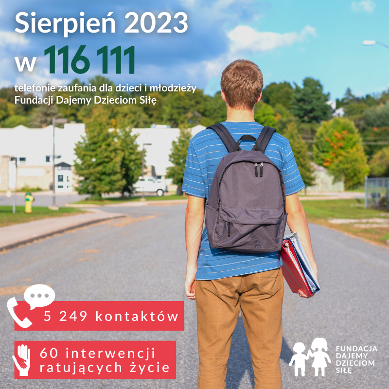 W roku szkolnym 2023/2024 do szkół będzie uczęszczać ponad 4 mln młodych ludzi, którzy w najbliższych dniach i tygodniach będą musieli odnaleźć się w szkolnej rzeczywistości. Z okresu wakacyjnego powracają do rutyny, nauki, która nie zawsze jest bezproblemowa, i konfrontacji z grupą rówieśniczą, która może być źródłem radości, ale też stresu. Według danych z raportu „Dzieci się liczą” Fundacji Dajemy Dzieciom Siłę aż 57% dzieci doświadcza przemocy rówieśniczej. Dorośli powinni pomóc dzieciom i młodzieży radzić sobie z tymi sytuacjami nie tylko przez wspieranie, ale też dostarczanie im narzędzi takich jak m.in. informacja o telefonie zaufania.